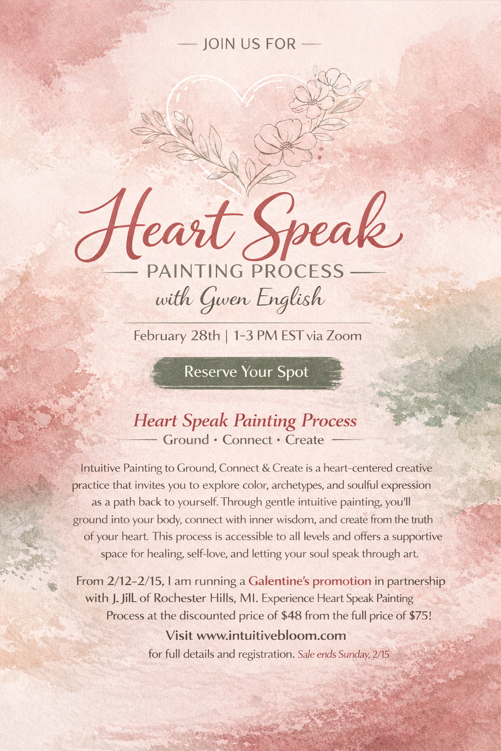 The HeartSpeak Painting Process: Intuitive Painting to Ground, Connect & Create is a heart-centered creative workshop designed to help you return to yourself through color, symbolism, and soulful expression. In this gentle two-hour experience, you’ll be guided through an intuitive painting practice that invites you to ground into your body, reconnect with your inner knowing, and create from the truth of your heart.